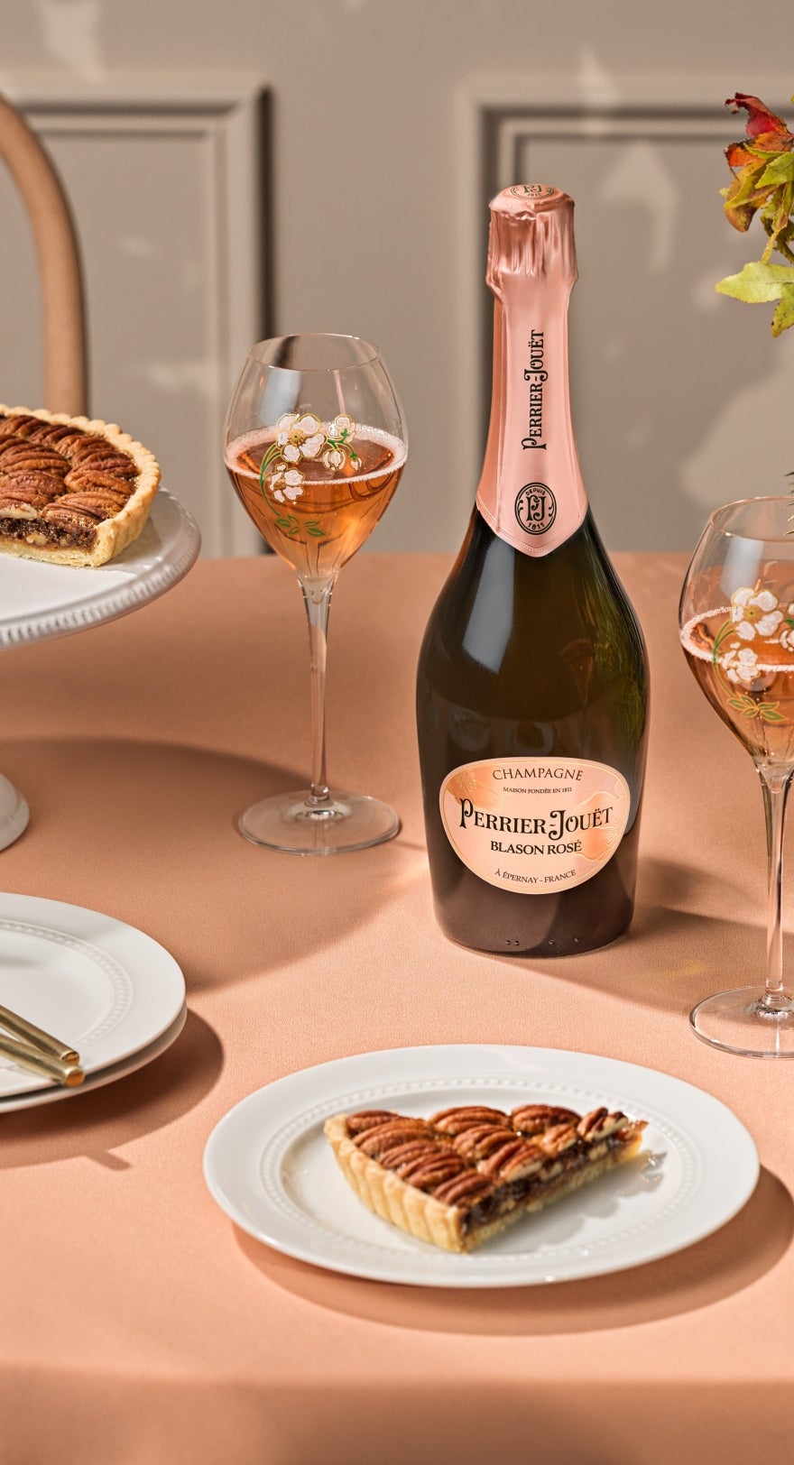 Looking for the perfect way to end your Thanksgiving meal? Why not choose an American classic which is sure to be a hit with guests! Pecan pie delights the hearts of food lovers with its rich, comforting flavors. End your festive meal on a high with our traditional pecan pie – crispy crust pastry and crunchy topping guaranteed! But which cuvée should you pair it with? We recommend Perrier-Jouët Blason Rosé. A rosé champagne that defies every cliché, whose floral nuances of Chardonnay boldly juxtapose with the rich fruit of Pinot Noir.
