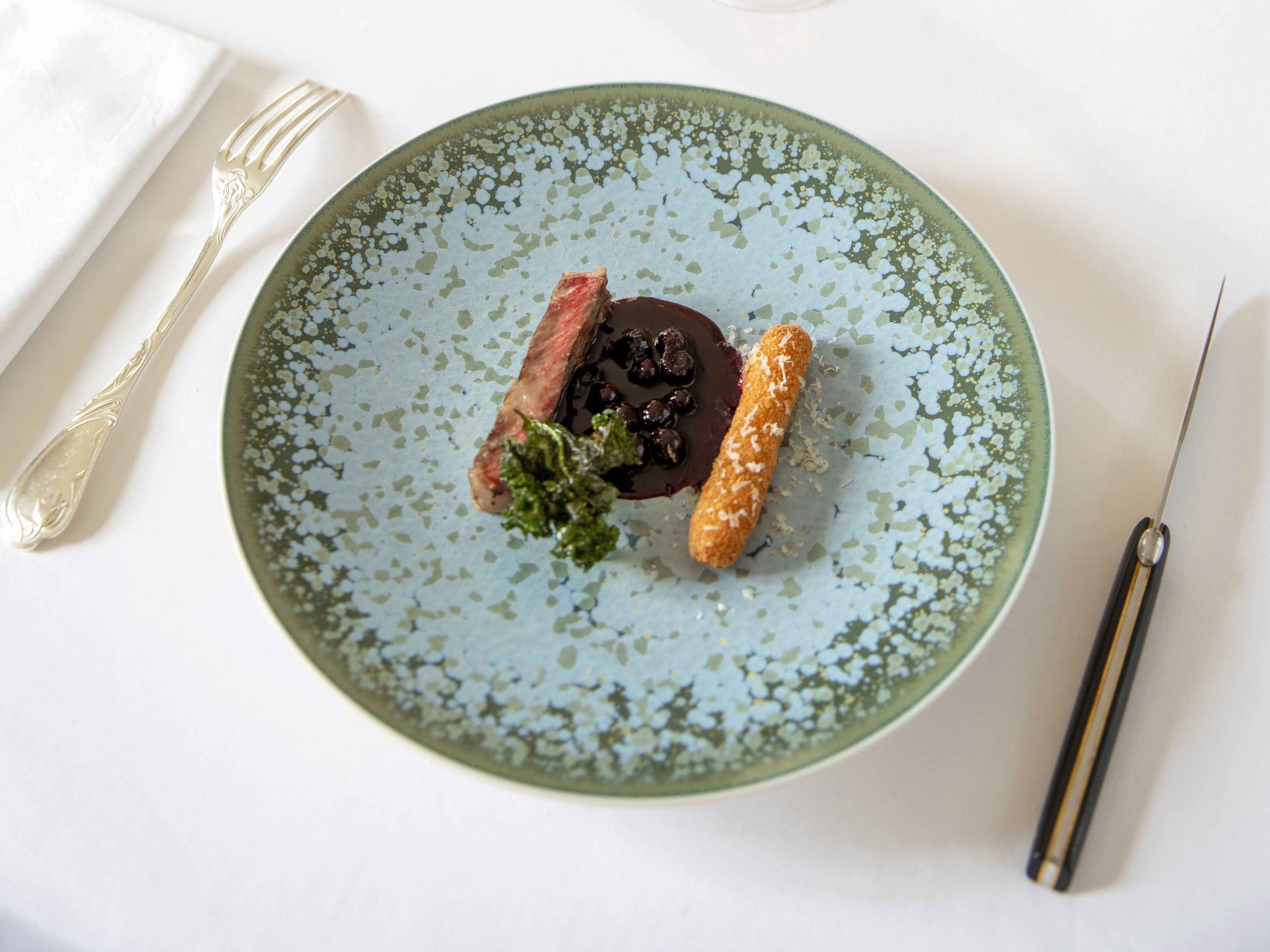 Place 2 dauphine potatoes parallel to the meat and grated Comté 24 months on top.