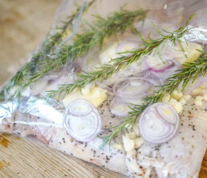 3. Place a tab of butter on each one of the thighs, then sprinkle in the shallot and garlic so that they are evenly distributed. Finally, add the rosemary and thyme so that they cover the thighs. If using a vacuum bag, seal according to your appliance directions. If using a zip-closure, carefully submerge the bag with the open side up, so that the pressure from the water eventually pushes out all the air, and seal to keep the water out. If necessary, weigh the bag down or clip to the side of the bath vessel, you’ll want the chicken to be fully submerged for proper cooking.