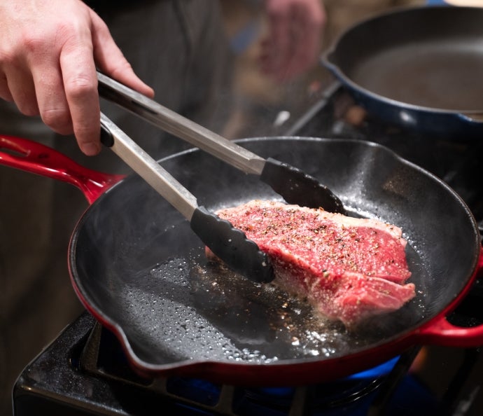 - Take your skillet out of the oven and place over high heat, adding enough canola oil to thinly cover the bottom. Once the oil is hot, use tongs to place the steaks into the pan and sear ALL sides for approximately 45-60 seconds each. This sear will help lock in moisture, resulting in a juicer final product. Move oven rack to the upper third of the oven and return the skillet and steaks to the oven and cook to desired doneness. For example, medium-rare will take around 5-8 minutes depending on the thickness of the steak and your oven settings.