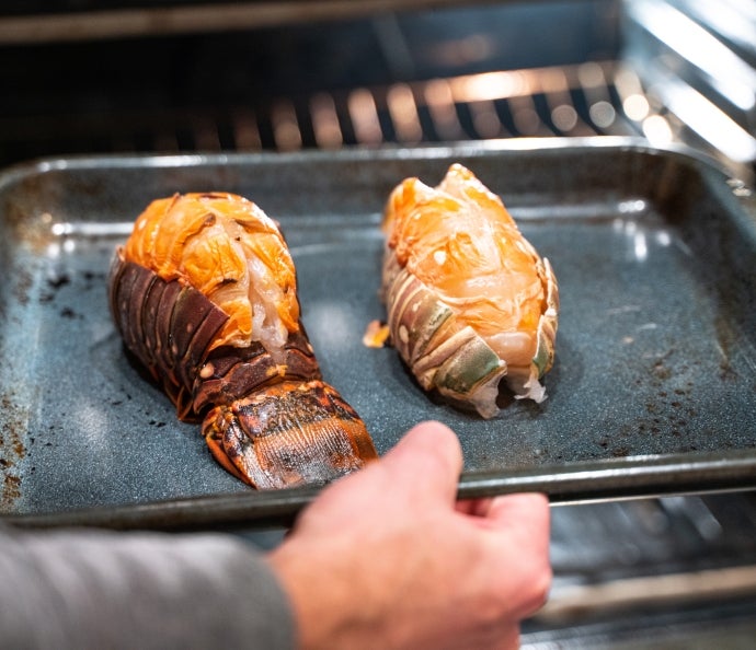 - While the steaks rest, place your cast iron or other oven-safe skillet into the oven so that it heats evenly (this is how you get a great sear/crust on your steaks), and take your lobster tails out of the refrigerator. Using kitchen shears, cut through the outer shell from the top towards the tail, being careful not to cut too deeply into the meat. Gently open the cut shell to expose the lobster flesh underneath and lift it away from the sides and bottom of the tail.