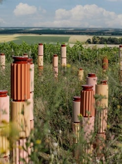 The first element of the project, the Ilot de Biovidersité (Biodiversity Island) is revealed in September 2024. 74 poles, positioned in an organic way, mark the 285 square metres of the space and keep humans at a reasonable distance from the nature which welcomes them, without totally cutting them off from it. These poles are structured by terracotta modules, 32 of which were designed to serve as habitats for insects thanks to a range of openings and cavities of different sizes and shapes. The native species that were planted in this reserved area will serve as food for the insects. Perrier-Jouët hopes that this project will contribute to have a positive impact on the local biodiversity and will measure it over the coming years, as nature operates in its own rhythm.