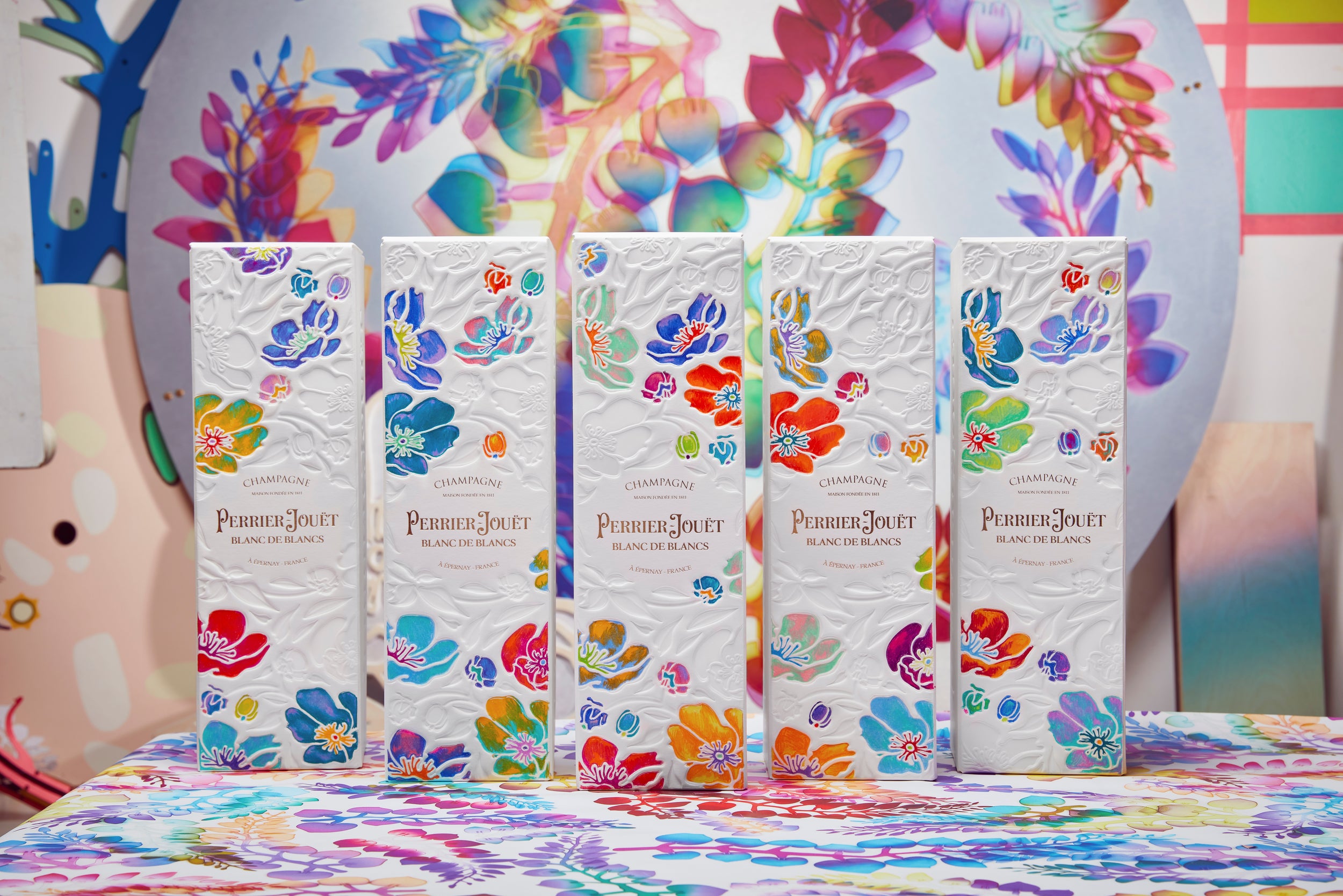I defined a color palette specifically for Perrier-Jouët, based on the bright colors of HyperNature and those used more than a century ago by Emile Gallé in his creations. I wanted to return these colours to the flowers he designed in 1902 for Perrier-Jouët.