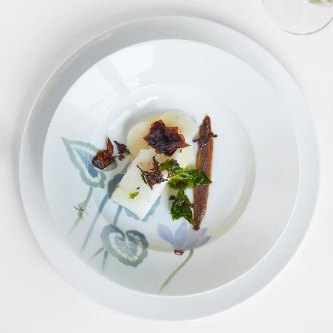 La cuisine de Sébastien Morellon, d’une grande pureté, fait écho à la finesse des notes de champagnes de la Maison. À dominante végétale et soulignée de notes florales, elle s’ancre dans son terroir.