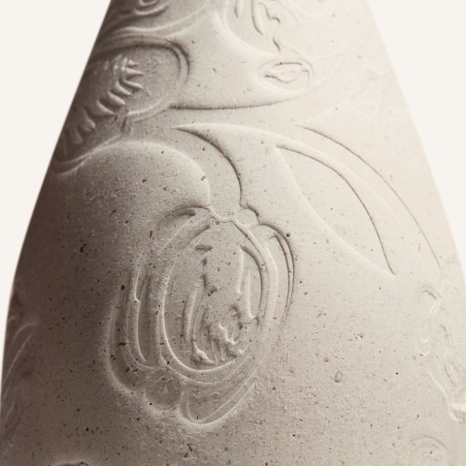 Créé à partir de pulpe de papier et de sarments de vigne*, Perrier-Jouët Belle Époque Cocoon a été conçu pour protéger la bouteille. Léger et décoré dans un style épuré, il a été pensé pour une utilisation optimisée des matériaux.