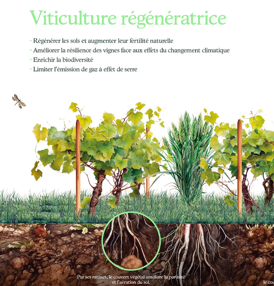 La Maison expérimente la viticulture régénératrice sur une dizaine d’hectares de son propre vignoble (41 % de sa surface totale) et partage ces nouvelles pratiques avec ses vignerons partenaires.