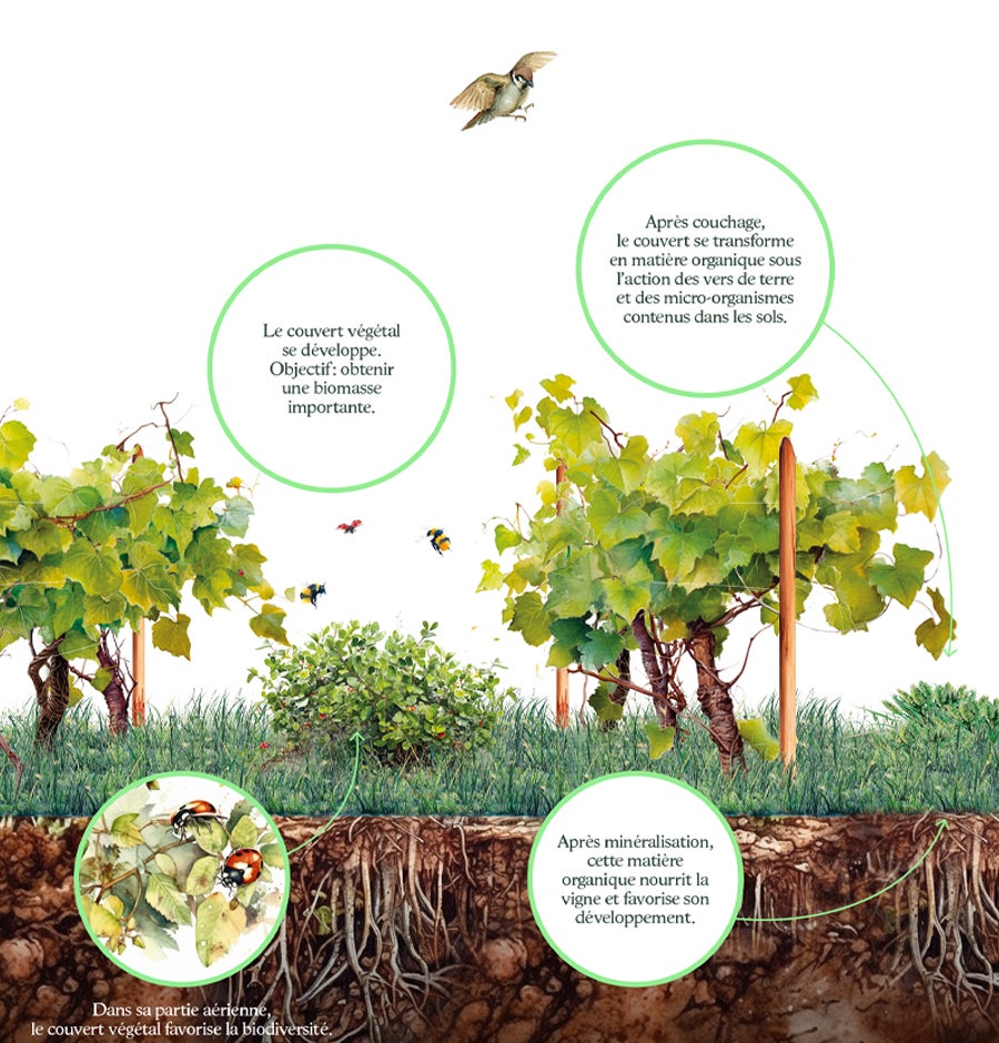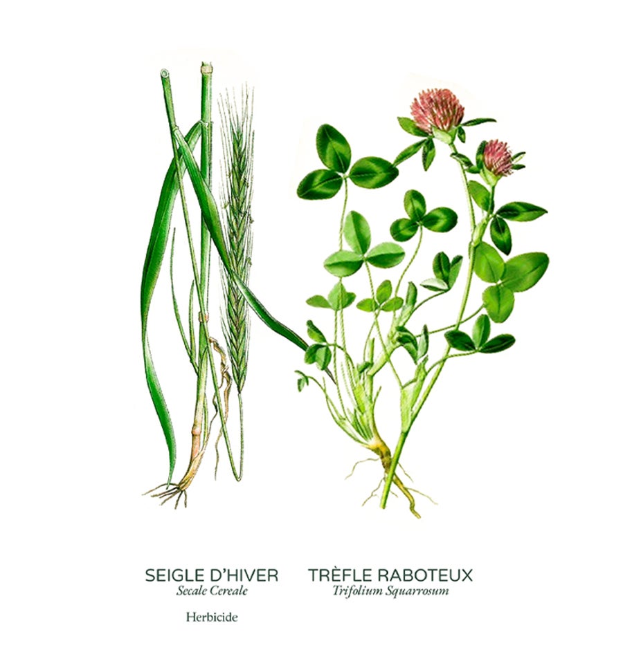 Les couverts biomasse sont semés après la vendange, puis se développent au printemps. Après couchage (début mai), ils apportent par décomposition, des éléments de nutrition à la biodiversité des sols (bactéries, champignons, lombrics) et contribuent à les rendre vivants, à les rééquilibrer. Le couvert végétal biomasse testé par la Maison Perrier-Jouët est composé de seigle forestier, de féverole, de trèfle squarrosum et de trèfle incarnat.