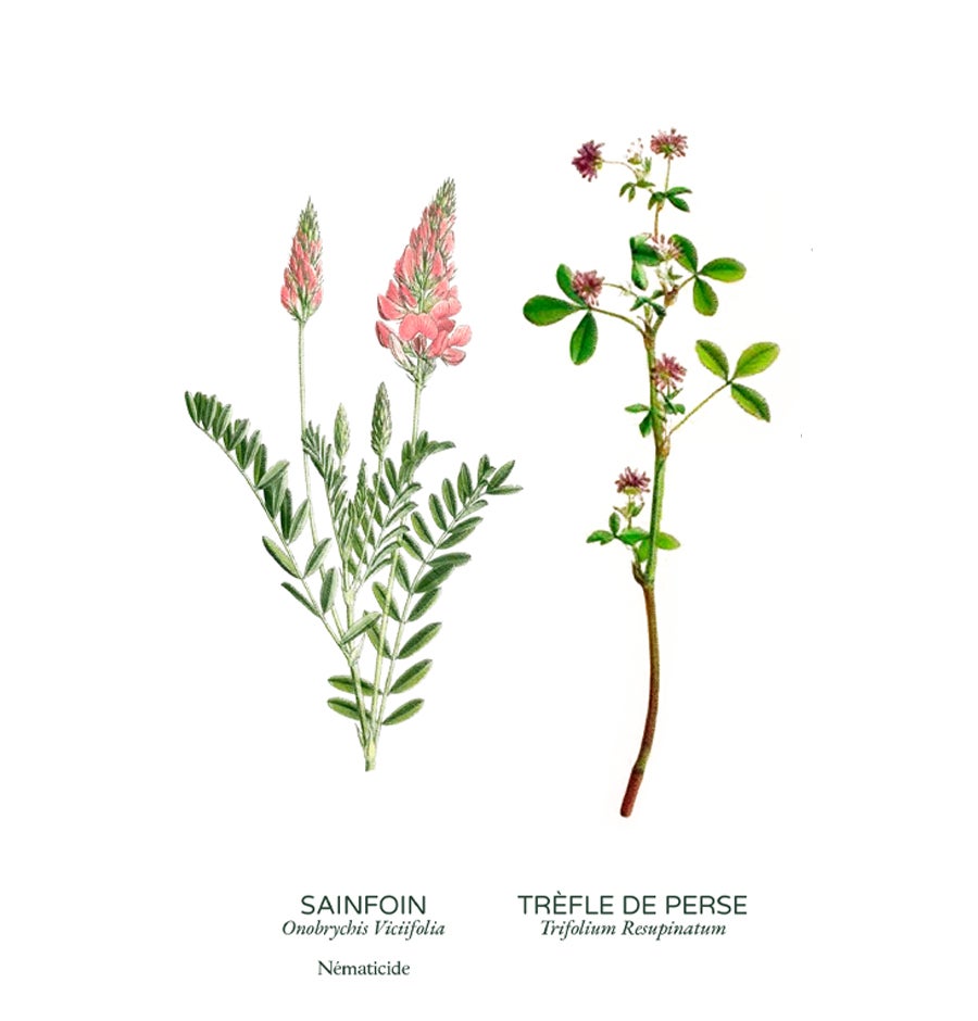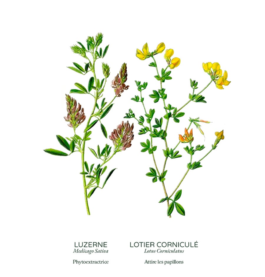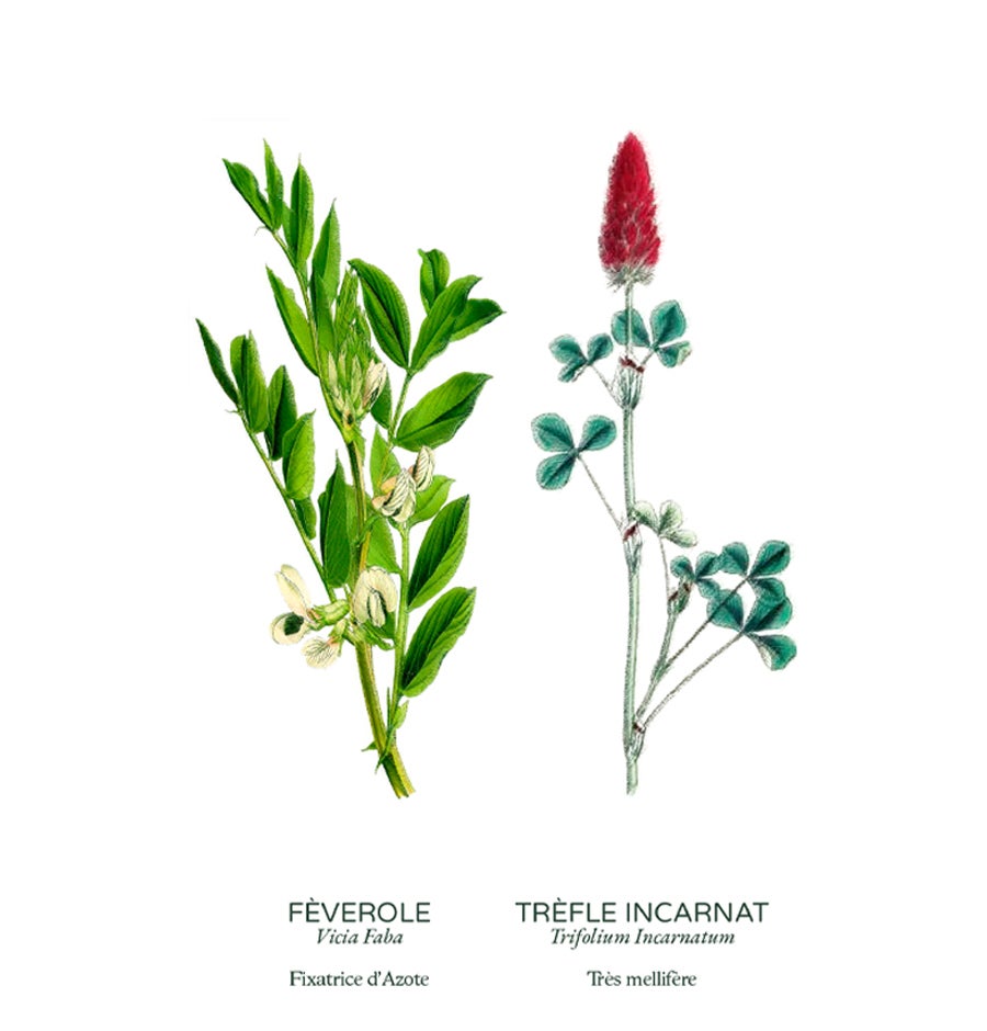 Les couverts végétaux fleuris ont quant à eux pour vocation de restaurer la biodiversité en servant de ressources alimentaires et de logis aux pollinisateurs. Leur système racinaire contribue également à la structuration des sols et constitue un apport de matière organique supplémentaire. Les couverts fleuris de la Maison Perrier-Jouët sont composés de 14 essences mellifères (plantes sauvages et légumineuses). Les légumineuses permettent quant à elles de fixer l’azote de l’air et de compenser la consommation d’azote des autres essences présentes dans le mélange.