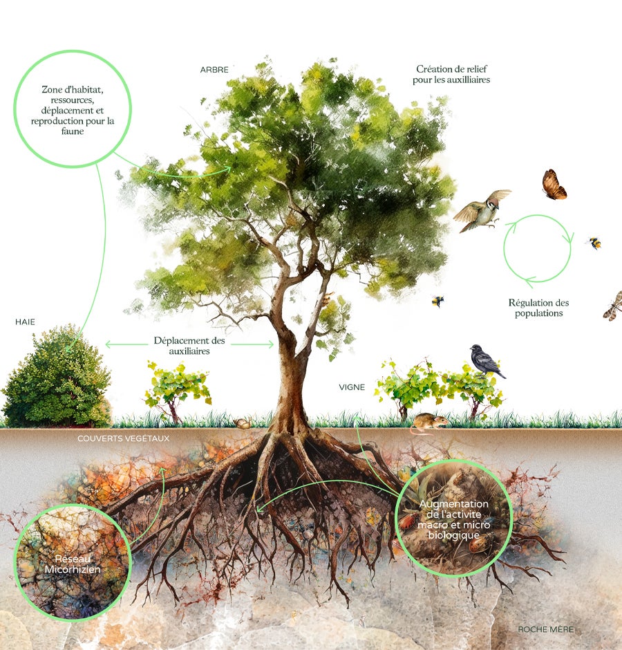 Ces corridors biologiques offrent aux animaux un espace pour se déplacer, se nourrir, se reposer et se reproduire. D’autres dispositifs tels que les nichoirs à chauve-souris, les perchoirs à rapaces et le comptage d’espèces permettent de favoriser la biodiversité dans le vignoble.