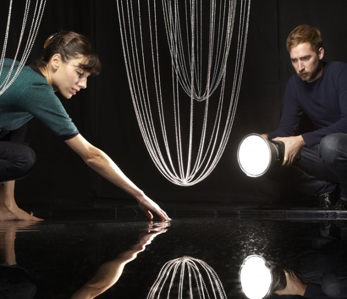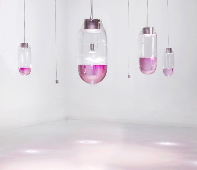 9つの手吹きガラスによる筒は、水の次元的な性質を使い、私たちの環境にあるスペースや物体の隠れたエッセンスをたどって光を屈折させています。絶え間なく進化する物語、生きた描画を作ります。真っ白な環境がスクリーンとなり、様々な視点から立ち止まり体験する物語になります。