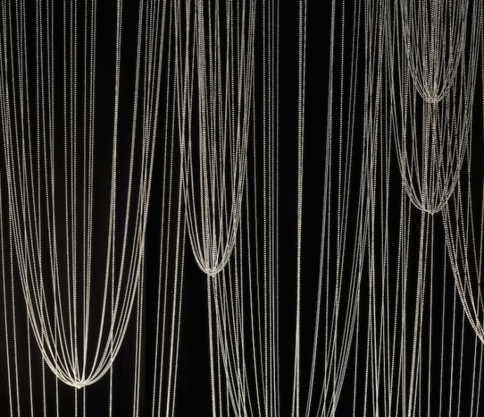 ペリエジュエのセラー内部の究極の静けさといった雰囲気の突然の変化にインスパイアされたグリテロの重みのあるビーズが連なるロープは、アーチ型の下に、露のしずくのように吊り下げられています。その下には、浅い水たまりが光学的な光とコントラストの効果を作り、思いもよらない永遠のような感覚を生み出します。変革への権威ある環境を提供しています。
