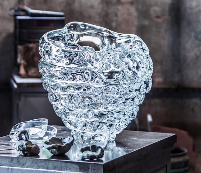 2つ目の作品はシャンパンを楽しむ時間を美しく彩る吹きガラスによるシャンパンクーラーです。大胆なデザインとクラフトマンシップを融合させたその本質的なフォルムの曲線はシャンパンの泡を想起させ、透き通るガラスは口の中ではじける泡の強さと儚さがのコントラストを表現しています。