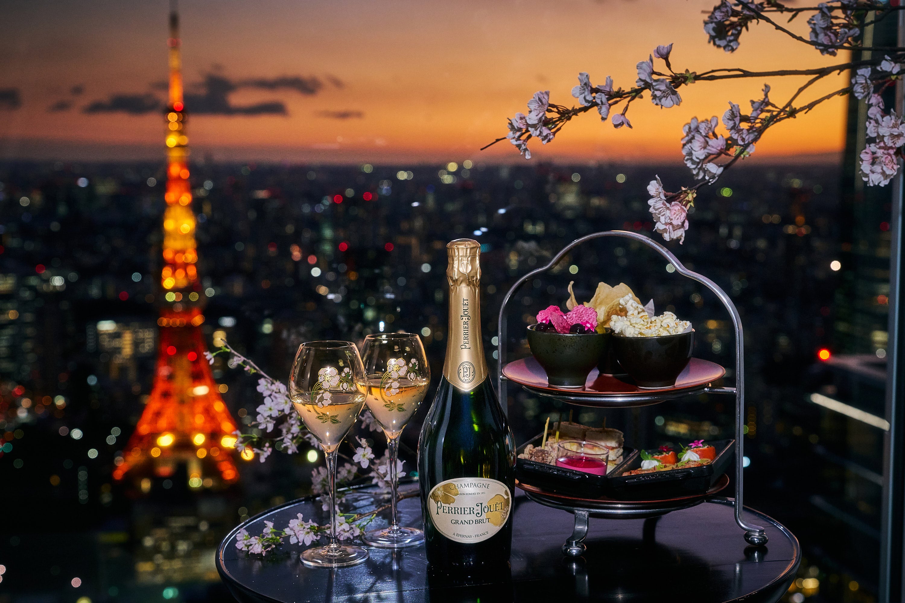 約250mの高さに位置するルーフトップ バーの奥、東京の空を一望できる特別なテラス「トライアングルエリア」にて、 桜が咲き誇る空中庭園『さくらガーデン』が今年もオープンします。美しく咲き誇る桜を満喫できる落ち着いた空間で、 1日18組限定の「夜桜プレミアムビュープラン」を提供いたします。「ペリエ ジュエ グラン ブリュット」を味わいながら、 華やかな夜桜とともに、シェフが特別に用意した目にも美しい春の味覚をお愉しみいただけます。また、51階メインダ イニングのザ タヴァン グリル&ラウンジ、1階ペストリー ショップでは、サーモンピンク色の輝きががこの季節にぴった りな「ペリエ ジュエ ブラゾン ロゼ」とのマリアージュを堪能いただける「桜アペリティフ」と「スイーツ&バブル – 桜」も 新たに登場いたします。 『ペリエ ジュエ』と煌めく夜景とともに、五感を満たす贅沢なお花見のひとときをお愉しみください。