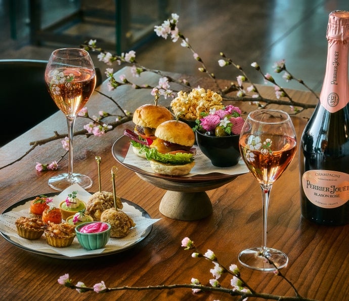 ザ タヴァン グリル&ラウンジのラウンジエリアでは、色とりどりの春 の味覚を楽しむことができるカナッペと、「ペリエ ジュエ ブラゾン ロゼ」とのマリアージュを愉しむ「桜アペリティフ」を期間限定で提 供いたします。トワイライトから夜のひとときを彩るこの特別なアペ リティフは、ペリエ ジュエの洗練された味わいを引き立て、優雅な ひとときへと誘います。店内は桜の花々で華やかに装飾され、東 京の夜景を望みながら、春の訪れを感じることができる時間をお 過ごしいただけます。大切な方と一緒に、春の息吹を感じる贅沢 なひとときをお愉しみください。