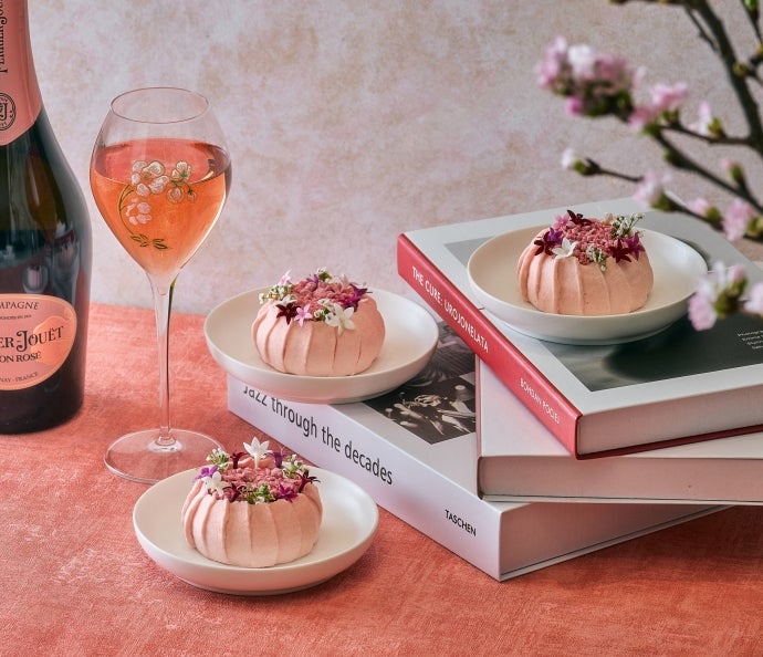 華やかな桜の季節にぴったりな1日8個限定のケーキ『Fleur(フル ―ル)』と、 「ペリエ ジュエ ブラゾン ロゼ」をお愉しみいただけま す。桜とルバーブを主役に、繊細な食感と香りを重ねたFleur。 爽やかな酸味のルバーブコンポート、桜シロップを染み込ませた スポンジケーキ、そしてペリエ ジュエのロゼ シャンパーニュの華 やかな香りを纏ったムースが織りなす、洗練された味わいが特徴 です。桜の装飾が美しい店内、またはテイクアウトでお花見気分 を味わいながら、春らしいひとときをお過ごしください。