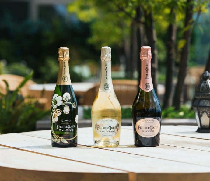 今回のコラボレーションでは、 『ペリエ ジュエ』 のラインナップから3種類、「ベル エポック 2015」、「ブラン・ド・ブラン」、「ブラゾン ロゼ」を、特別なパニエでプレゼンテーション。イギリス人シェフ、トム・エイキンズがGarden Terraceのために考えたスナックメニューとともにお愉しみいただけます。