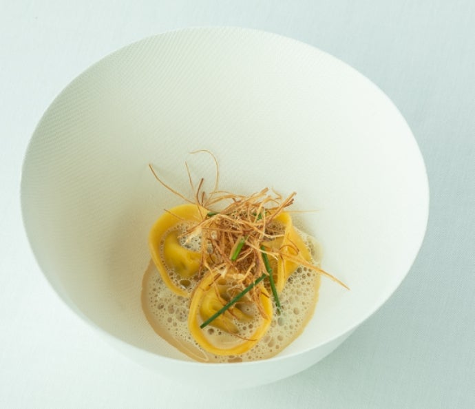 黒トリュフとブリードモーの香りを生地に包み込みトルテリーニに仕上げた。